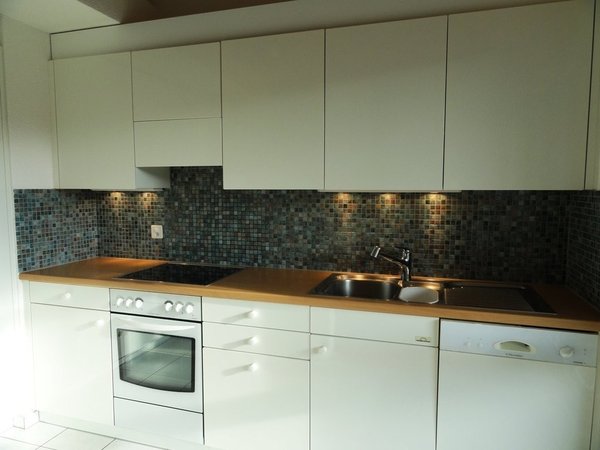 - offene Küche mit Geschirrspüler und Glaskeramikkochfeld